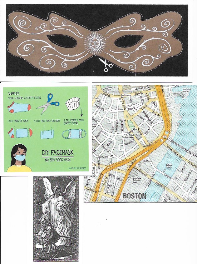 Each artwork Bitetti leaves behind consists of a large clear plastic bag, a copy of Leaves of Grass (1855 version) and large white envelope which contains information about the project and the site Bitetti chose. Inside the white envelope is a clover green colored envelope that contains images of Whitman, Emerson, the 16th U.S. President-Abraham Lincoln, and the 44th U.S. President, Barack Obama.These images not only reference the historic importance of Emerson, Lincoln, and the U.S.’s first African American president, but directly call attention to Whitman’s abolitionist/anti-slavery beliefs. There are also several visual references to masks (one can be used as a bookmark) as well as historical photographs and maps of the city of Boston-one dating from the timeframe of Whitman’s visit and a contemporary map of the city. Bitetti has also included blades or leaves of grass from the Boston Common and her signature guardian angel image. (The photographs of Whitman, Emerson, and Lincoln, were all taken by photographer Matthew Brady who had a daguerreotype portrait studio at the corner of Broadway and Fulton Streets in New York City.)