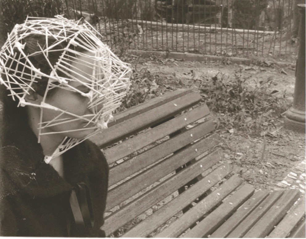 Frau Nestkopf is a lady dressed in black using a mask made of small pieces of wood, similar to a nest.Frau Nestkopf is someone that feels trapped and searches the contact with pigeons and seagulls.These animals easy adapt to any climacteric condition, represent to this woman a symbol ofresistance and adaptability, states that she is unable to reach. In her loneliness, she is secure but notfree. Her confrontation with these birds show us the dichotomy between choking/freedom,detention/shelter. I used this mask in my video Frau Nestkopf, done 10 years ago. Now during thepandemic period, I feel that the motivations I had back then still make sense.