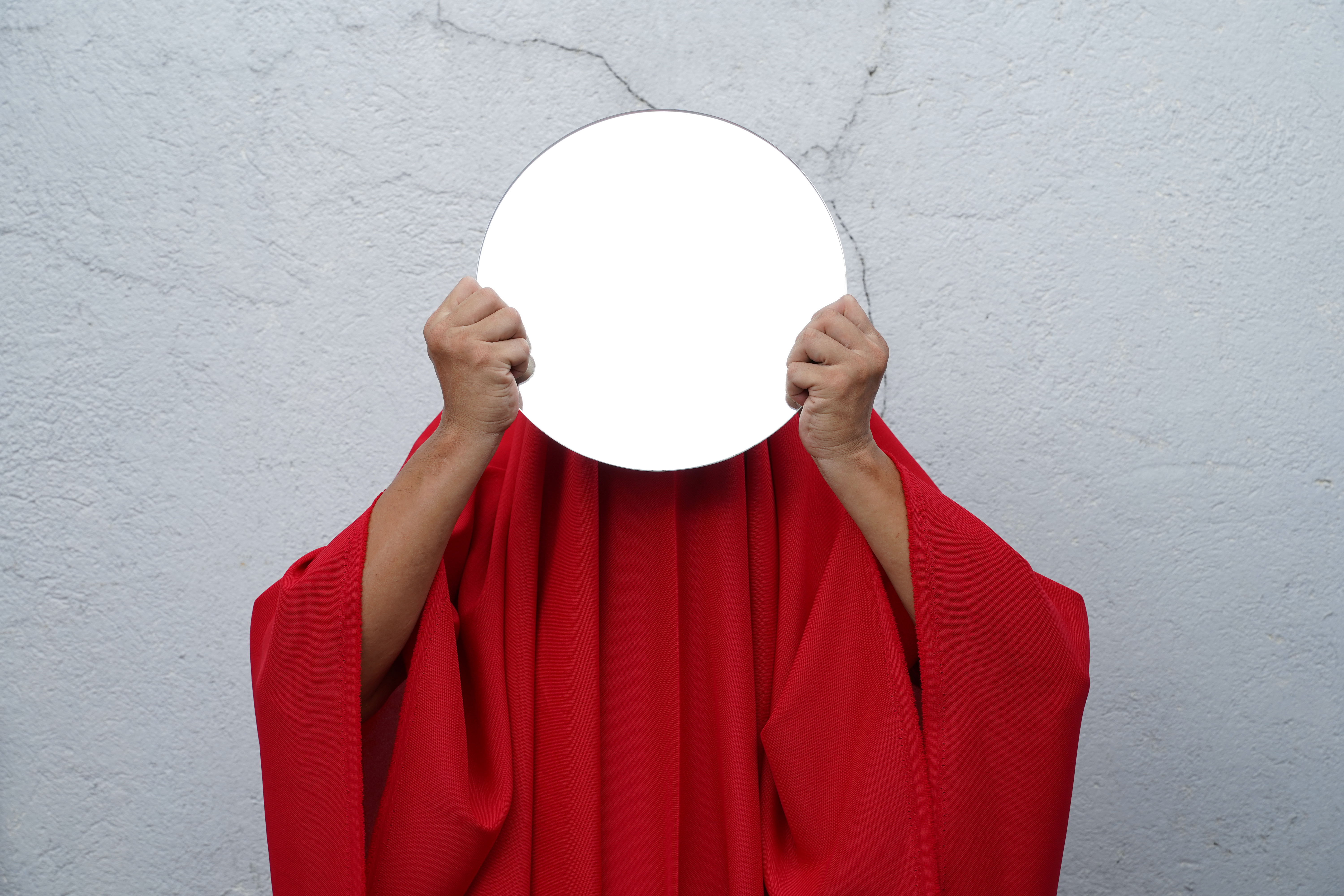 As seen in the photograph, a shrouded man is holding a circular mirror that serves as a mask. It represents that the form of comedy reflects on tragic realities. When comical acts gets bleaker and exhibits absurd statements that tackles real world issues and happenings, this only states the level of our world’s cruelty and tragedy. That’s why the mask is a mirror, comedy reflects tragedy, hence the title of the work “Comedy wearing the mask of tragedy”.