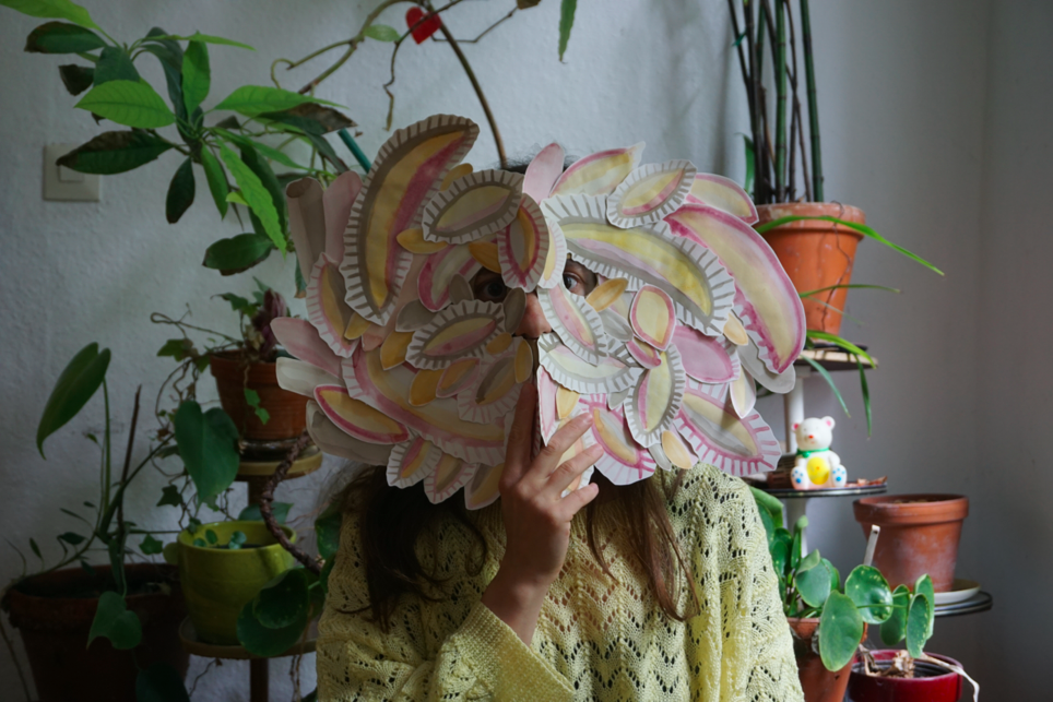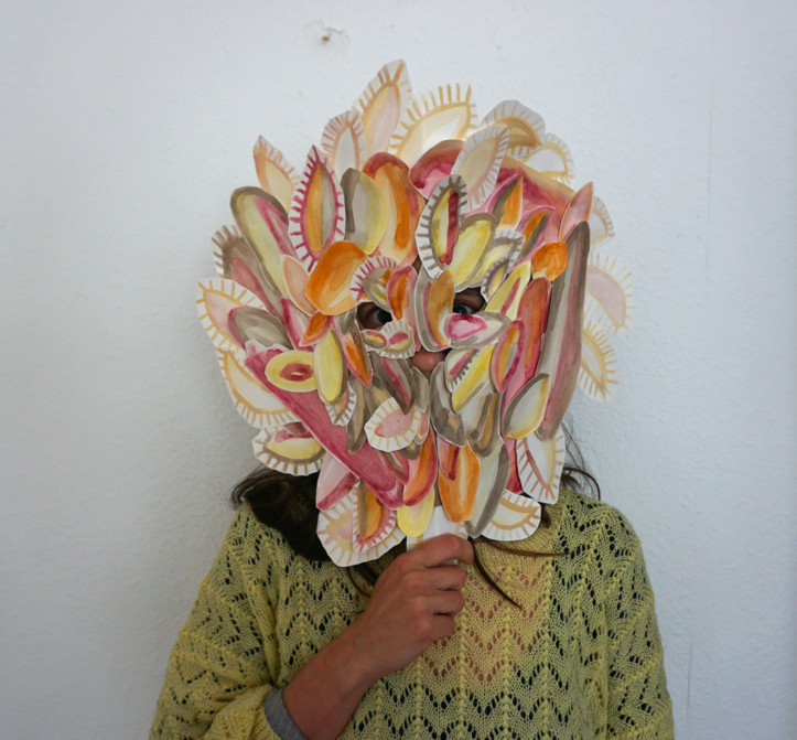 Soon my room got full of colour studies made of vegetable roots self made painting. After getting your invitation for the London Biennale and inspired by your photo, I thought about doing a mask using vegetable root paint. All 3 masks were done with vegetables I also consumed in my food, the paper is from the bags I bought the vegetables, as well as left overs from other works, the brush I used is from the 60s and belonged to my mother when she was on primary school.